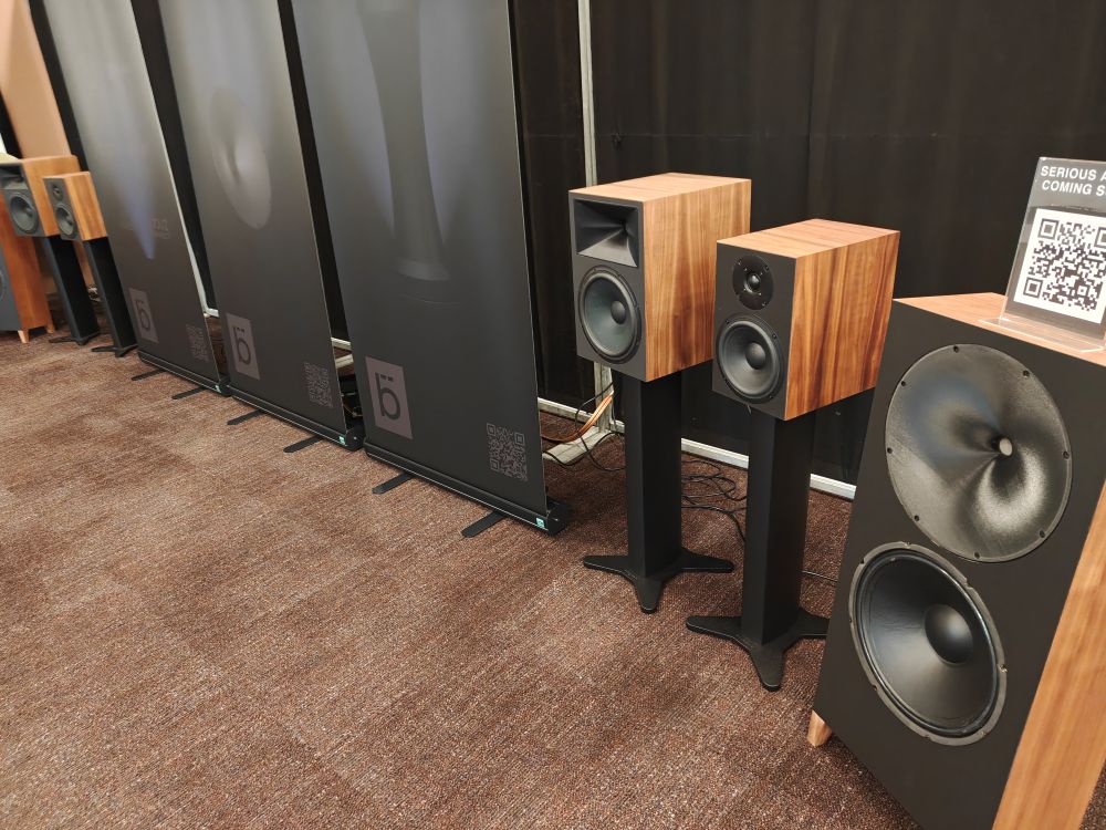 Der var også en lille udstilling med “serious sound coming soon” og nogle forskellige konstruktioner, alle så aktive ud, og mindst en med 3D printet waveguide, og så ellers ikke så meget mere. Der var en QR kode, men gennemsnitsalderen blandt de besøgende taget i betragtning havde en firma-mail og ditto hjemmeside nok været bedre markedsføring, særligt da navnet lå ret tæt på messe-arrangørens, det er nemlig Bülowsen Audio, og lidt google-fu afslører at der er en model der hedder B7 og åbenbart ikke er mere hemmelig end at den allerede er blevet officielt testet.