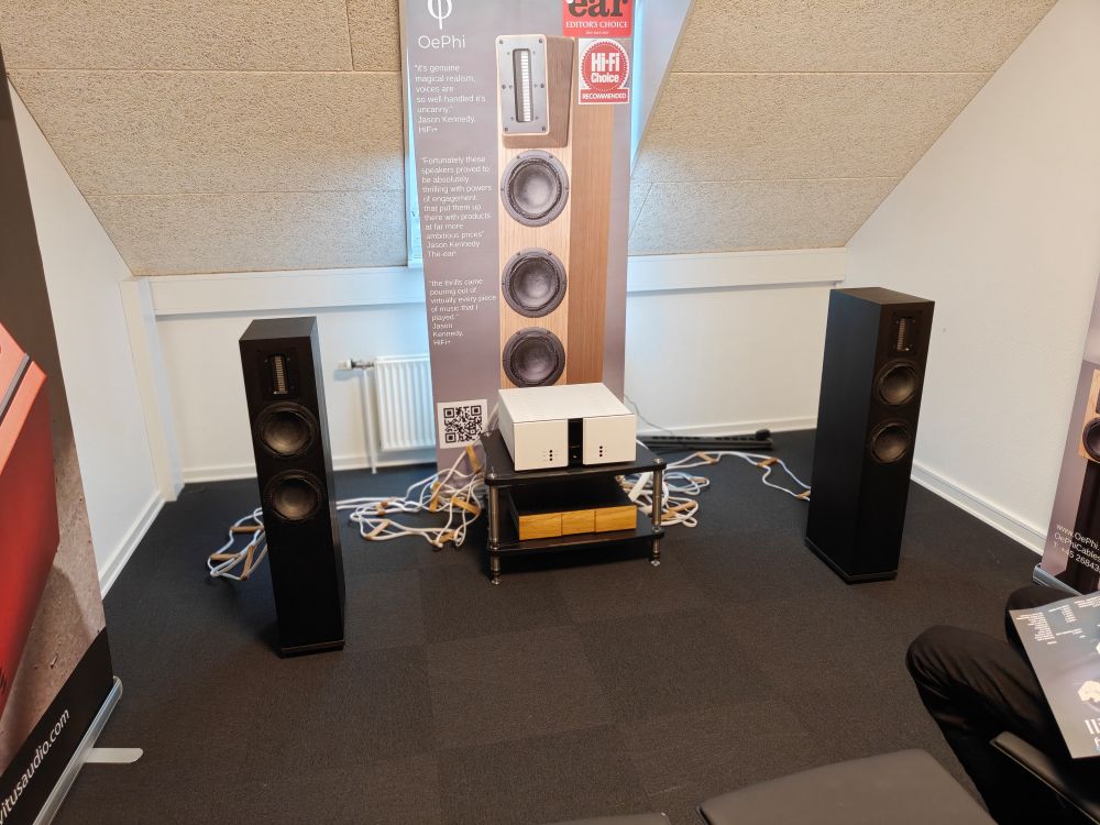 En ny spiller på markedet er danske OePhi Audio der havde hele to demorum til at fremvise deres højttalere med Purifi enheder og egne kabler. I det ene, sådan semi-billige rum spillede man på Ascendance 2 til 33.500 kroner, en VTL IT-85 til 70.000, og Oephis egen streamer-Dac til 75.000, signal, LAN og strømkabler til en hel del penge, og en strømfordeler til 37.000 kroner.
