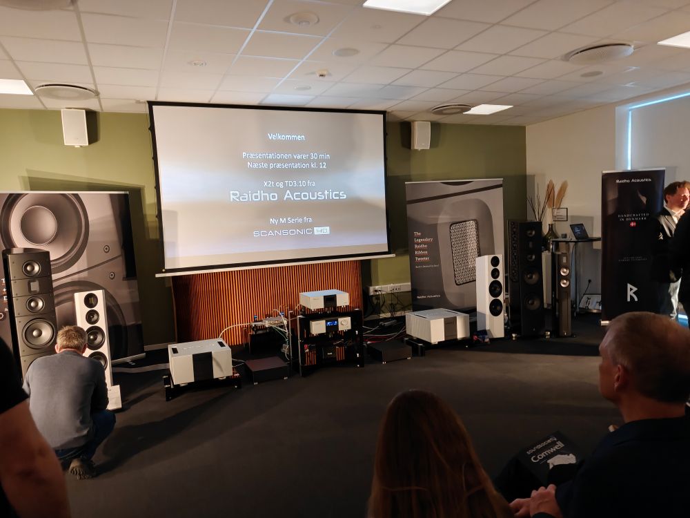 I Raidho Acoustics rummet var der ikke ligefrem sparet på noget. Brancheveteranen Morten Nielsen styrede løjerne med rutineret hånd, og der blev fremvist den nye MD serie fra sub-brandet Scansonic i form af M30.2 modellen til 26.000 kroner, imens at man leverede demo af X2t jubilæumsmodel og den store TD3.10. Elektronikken var fra EMM LABS, både monoblokke og forforstærker samt afspiller, og kostede ligesom TD3.10 højttalerne en million kroner. Men så er det også med diamantbelagte basenheder og den karakteristiske bånddiskant.