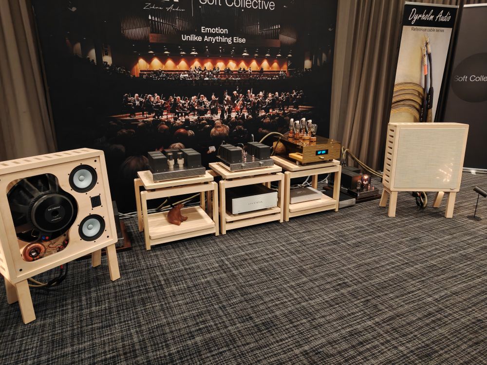 Zikra Audio havde også leveret forstærkning med 211 effektforstærkere og tilhørende forforstærker til Soft Collective, der herudover havde en Pacific 2 DAC fra Lampizator, Dyrholm Audio kabler, DCS transport og Hydra Triton power conditioner. Soft Collective fremviste måske en af messens mest spændende og betalbare højttalere, SC-05 eller hvad man nu skal kalde en pris på 150.000 kroner. Med 18” basenhed er denne multi-baffle, dipolhøjttaler lidt speciel, særligt da den ikke fylder det store, og alligevel formår at spille højt og dybt, blandt andet grundet brugen af bånddiskant.